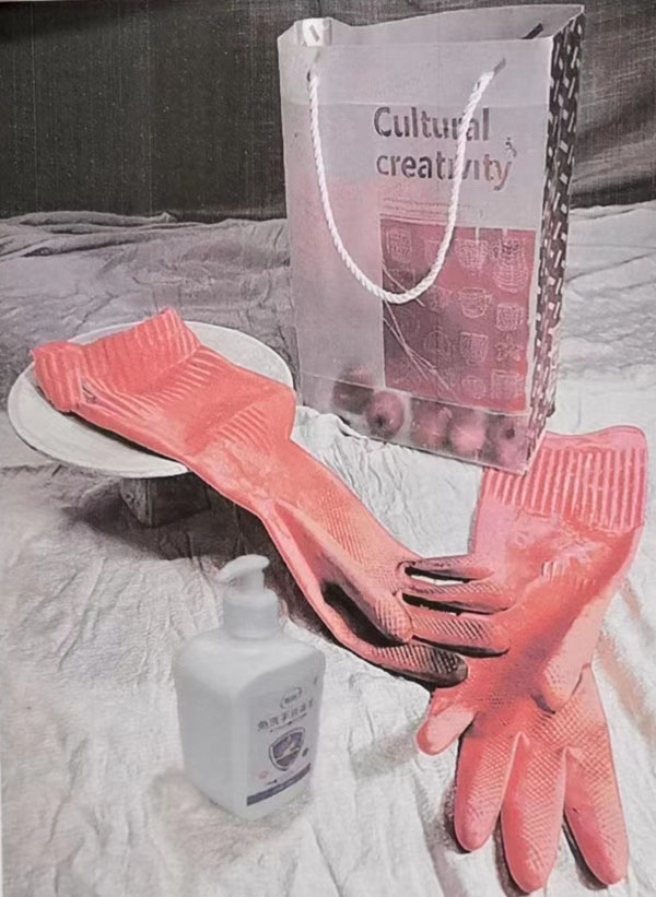 素描。一双红色的橡胶手套,一瓶消毒液,一个半透明购物袋(内装山楂果若干)、一个白色高脚托盘、两块浅色衬布、一块深色衬布。