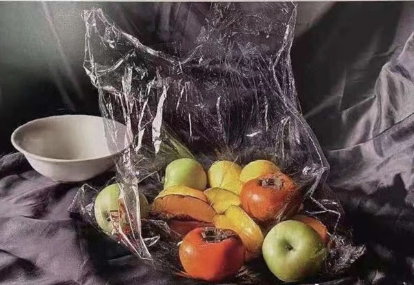 模拟写生,一个透明塑料袋(袋中有三个青苹果、两个柿子、三个杨桃、两个柠檬)、一个白碗、一块深色衬布